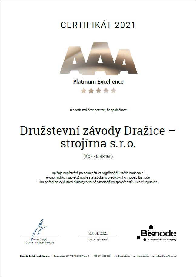 We have won the international AAA Platinum award from Bisnode which is a prestigious independent rating with a 112-year tradition. This certificate confirms that we are one of the most trusted companies in the Czech Republic because, for the last five years, we have been meeting the strictest criteria for evaluating economic entities according to the Bisnode statistical predictive model.